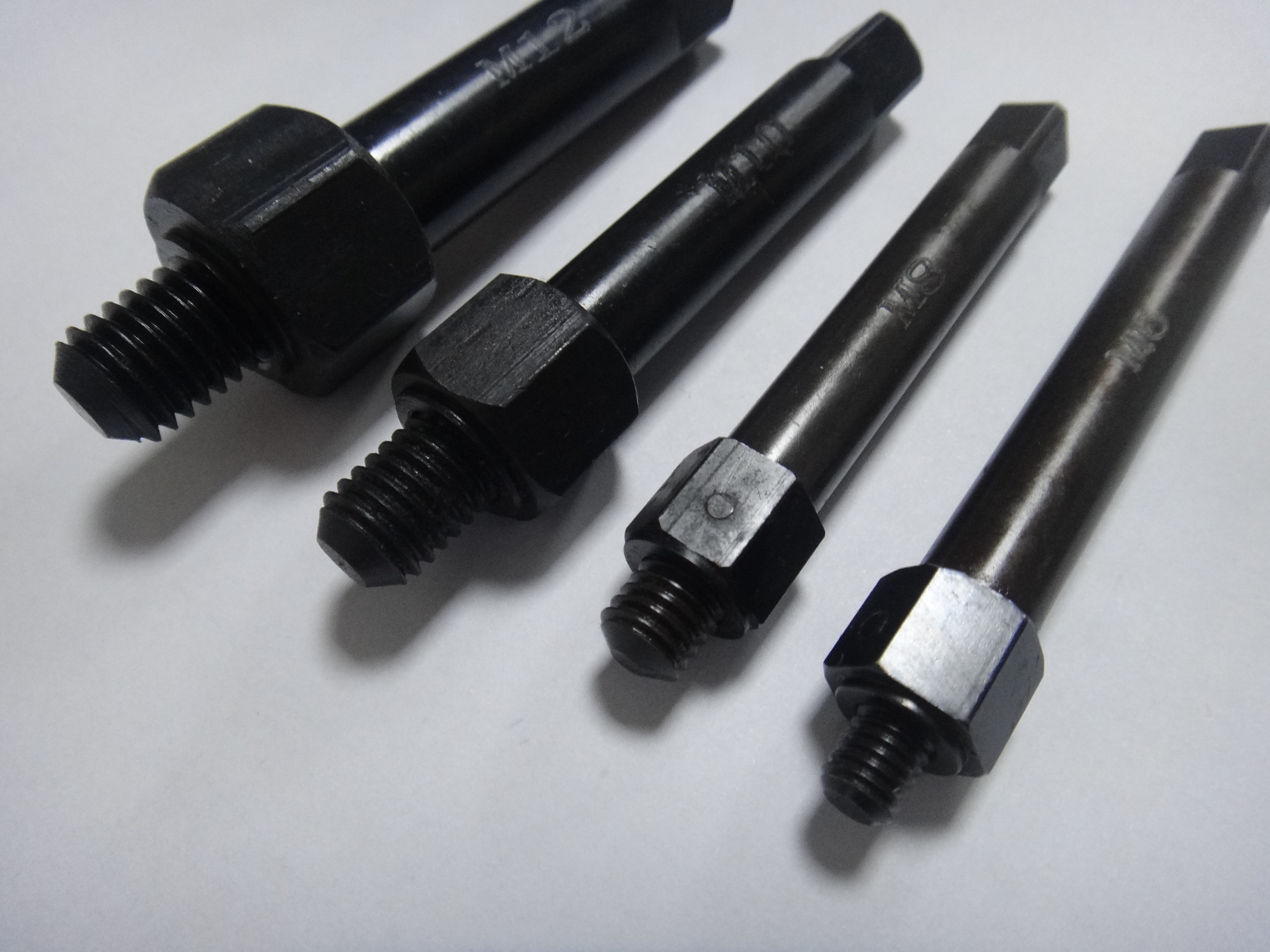 對(duì)有折斷槽的鋼絲螺套,旋入螺孔后應(yīng)將安裝柄去除,需用去柄工具。通孔時(shí),要將鋼絲螺套安裝柄折斷,一般用沖斷器對(duì)準(zhǔn)安裝柄,用 200g 左右的榔頭猛打一下即可去除,對(duì)于 M18×2.5 以上的粗牙鋼絲螺套和 M14×1.25 以上的細(xì)牙鋼絲螺套 , 用尖嘴鉗上下彎曲安裝柄就能折斷,然后將斷下來的安裝柄從螺孔中取出即可。