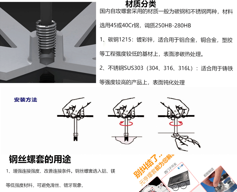 簡易螺紋護(hù)套安裝工具有螺紋頭、光桿兩種。用于少量安裝,一般維修、實驗時用,操作時不易安裝,鋼絲螺套容易報廢。