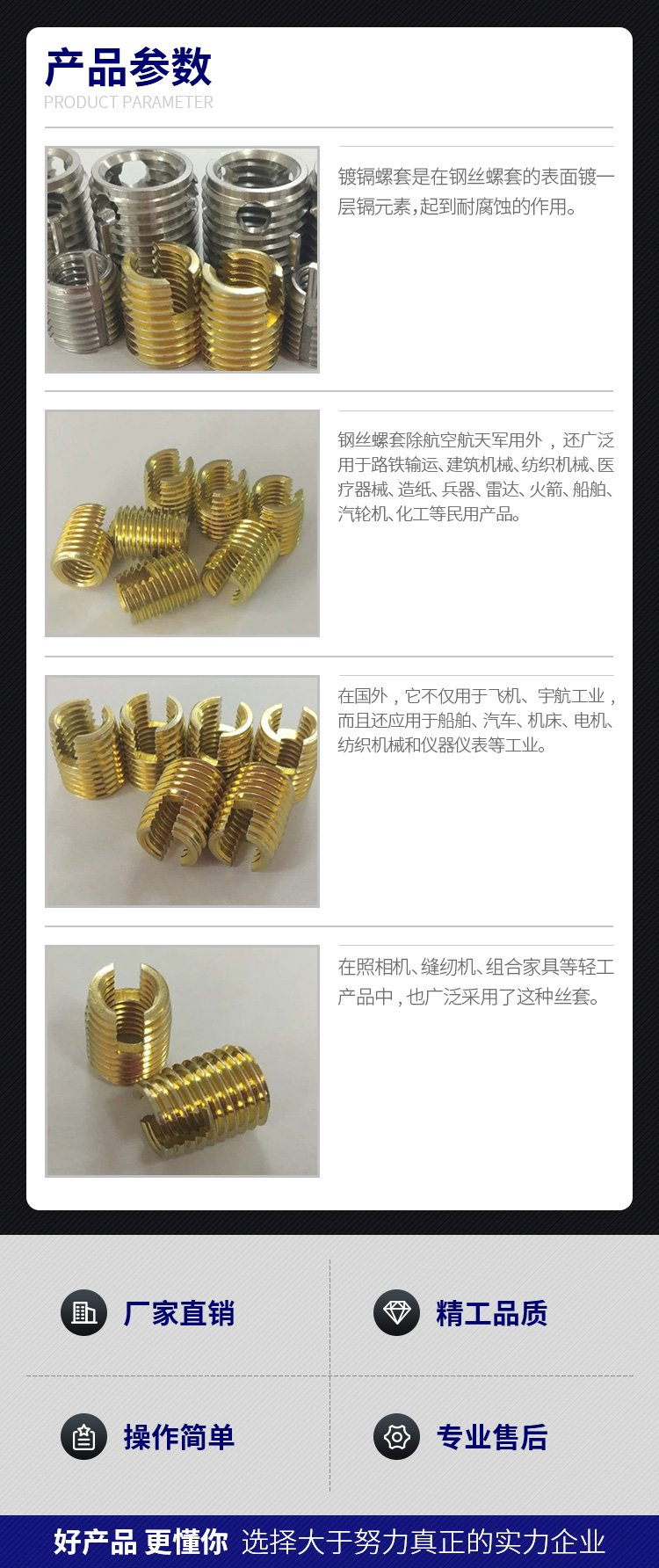 簡易螺紋護套安裝工具有螺紋頭、光桿兩種。用于少量安裝,一般維修、實驗時用,操作時不易安裝,鋼絲螺套容易報廢。