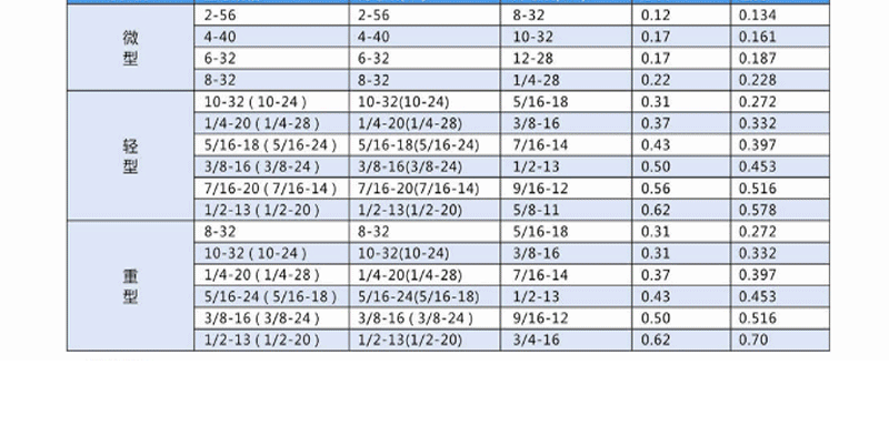 螺紋規(guī)格 | 鉆頭直徑( mm) | 螺紋規(guī)格 | 鉆頭直徑( mm) |